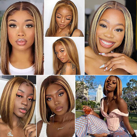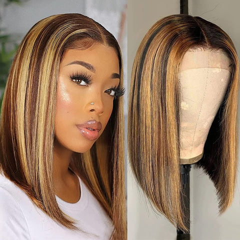 YUZHU Short Bob Highlight Blonde #4/27 Straight 13x1 T Part HD Lace Front Human Hair Wigs
